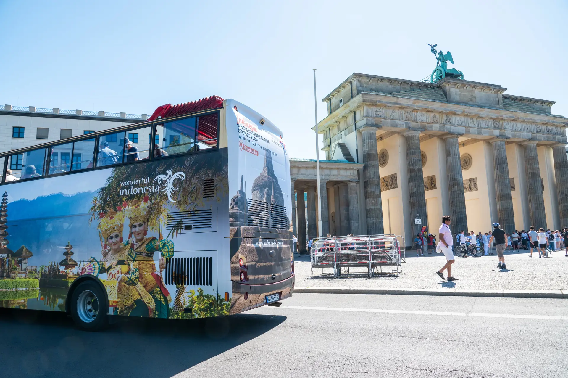 - Berlin: Kampanye ditampilkan melalui dua unit open great bus yang dibalut penuh Wonderful Indonesia, melintasi destinasi utama seperti Kurfürstendamm dan Alexanderplatz. Ditambah satu unit digital screen di area perbelanjaan ikonik. * Roma: Promosi serupa menggunakan dua unit open great bus yang melewati rute ikonik kota Roma, seperti Colosseo dan Stazione Termini. Pemasangan digital maxi billboard juga dilakukan di Piazza del Risorgimento, dekat Vatikan.